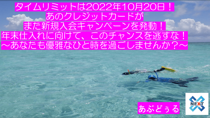 タイムリミットは2022年10月20日!あのクレジットカードがまた新規入会キャンぺーンを発動!年末仕入れに向けて、このチャンスを逃すな!~あなたも優雅なひと時を過ごしませんか?~