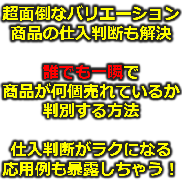 超面倒なバリエーション商品の仕入判断も解決 誰でも一瞬で 何個商品が売れているか判別する方法 仕入判断がラクになる 応用例も暴露しちゃう!