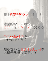 売上50%ダウン!?!? 絶望的なこの状況 ピンチをチャンスに変える ○○化給付金を ご存知ですか? 知らないと最大100万円の 大損失を受けますよ?