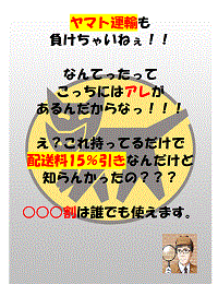 ヤマト運輸も負けちゃいねぇ!!なんてったってこっちにはアレがあるんだからなっ!!え?これ持ってるだけで配送料15%引きなんだけど知らんかったの???○○○割は誰でも使えます。