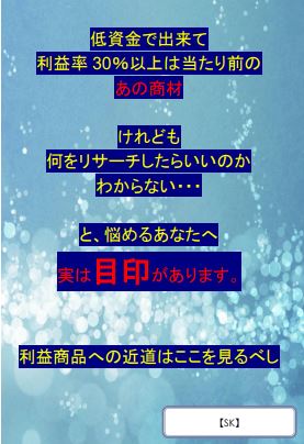 低資金で出来て 利益率 30%以上は当たり前の あの商材 けれども 何をリサーチしたらいいのか わからない・・・ と、悩めるあなたへ 実は目印があります。 利益商品への近道はここを見るべし
