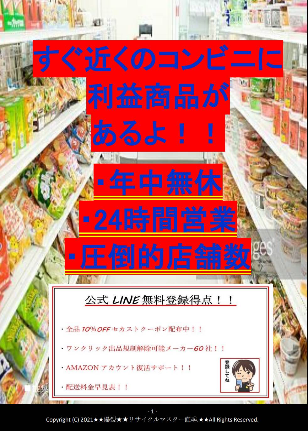 コンビニ仕入れをマスターすれば24時間好きな時間に 仕入れが可能になります。また,買い物ついでに 仕入れて帰宅すれば見込み利益でお金が増えます!!