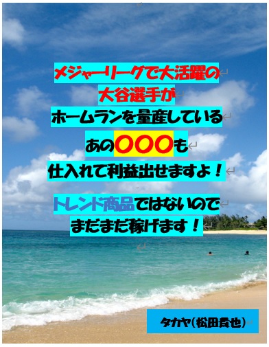 メジャーリーグで大活躍の大谷選手がホームランを量産しているあの〇〇〇も仕入れて利益出せますよ!トレンド商品 ではないのでまだまだ稼げます!