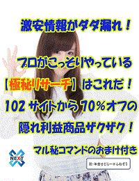 ライバルが見つけられない隠し利益商品がザクザクみつかります。 102サイトから70%オフの商品を独自の方法であぶり出します。 時短テクに必須のマル秘コマンドもプレゼント!